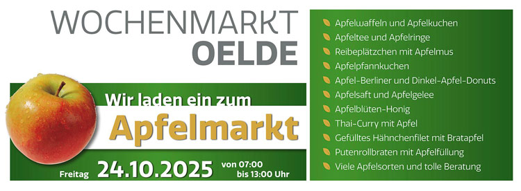 Am Freitag 24. Oktober von 7:00 bis 13:00 Uhr laden die Wochenmarkthändler in Oelde herzlich zum Apfelmarkt ein. Zur Unterstützung und Werbung für die Aktion halten die Mitglieder des Gewerbevereins in der Innenstadt vorab „Körbe“ zur kostenlosen Abgabe von Elstar Testäpfeln an Kundinnen und Kunden und einen Infoflyer bereit.